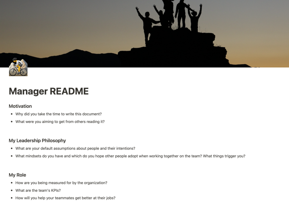 - Share your README when on-boarding direct reports and use it for expectation setting in a new work environment
